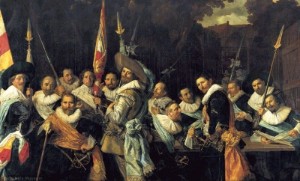 Zo maakt Nico een tweetal kopiën naar het doek Vergadering van officieren en onderofficieren van de Cluveniersschutterij van Frans Hals (kopiën van de hoofdfiguren Andries van Hoorn en Dirk Verschuyl).
